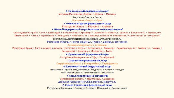 6. Дальневосточный федеральный округ Приморский край: г. Владивосток, г. Уссурийск, г. Артем, г. Находка Камчатский край: г. Петропавловск-Камчатский